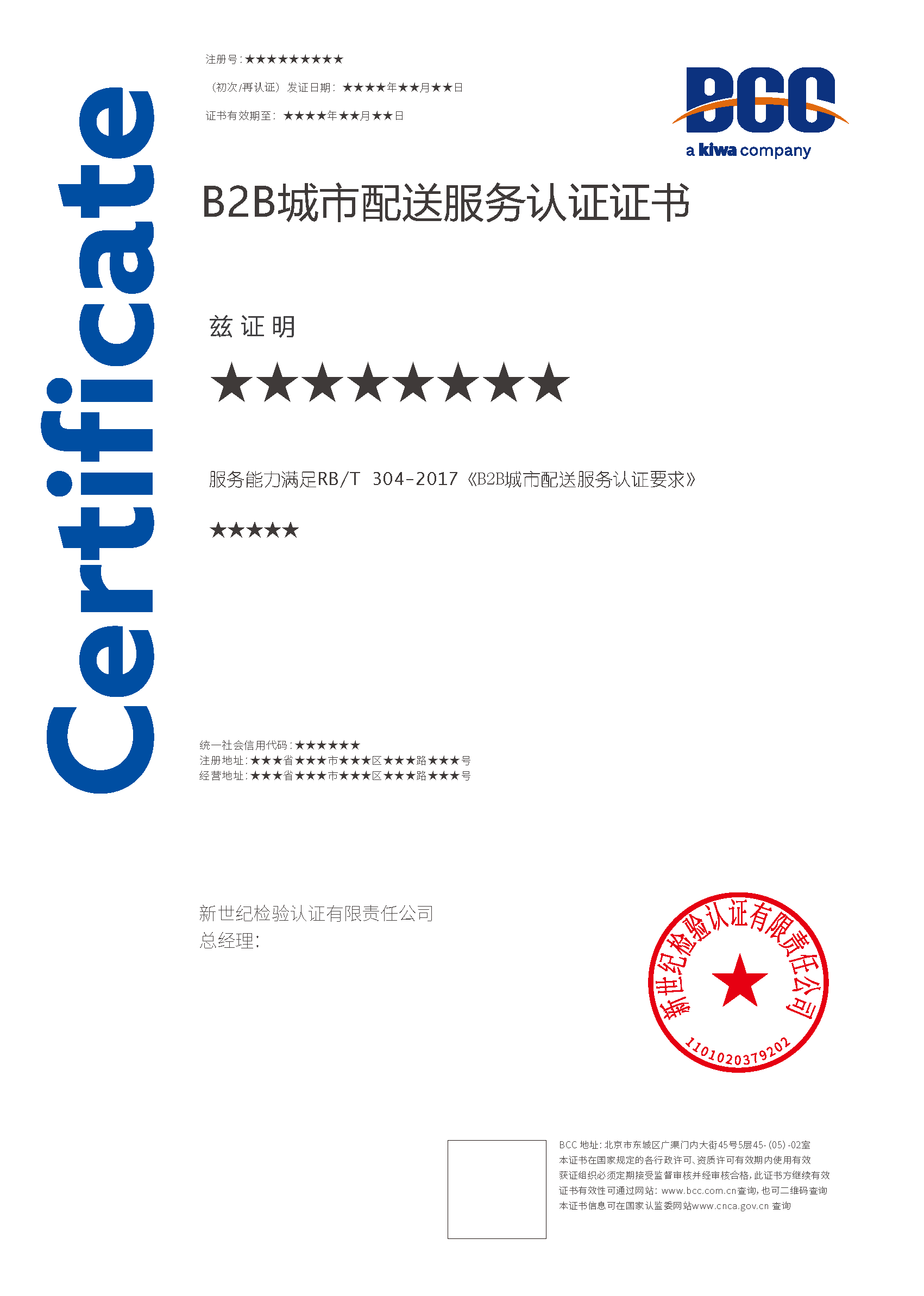 B2B城市配送服務(wù)認(rèn)證的依據(jù)是RB/T304-2017《B2B城市配送服務(wù)認(rèn)證要求》,可以在城市規(guī)劃區(qū)內(nèi),根據(jù)顧客要求,對(duì)貨物進(jìn)行揀選、加工、包裝、分割、組配等作業(yè),并按時(shí)送達(dá)指定地點(diǎn)的物流服務(wù)活動(dòng)進(jìn)行認(rèn)證。