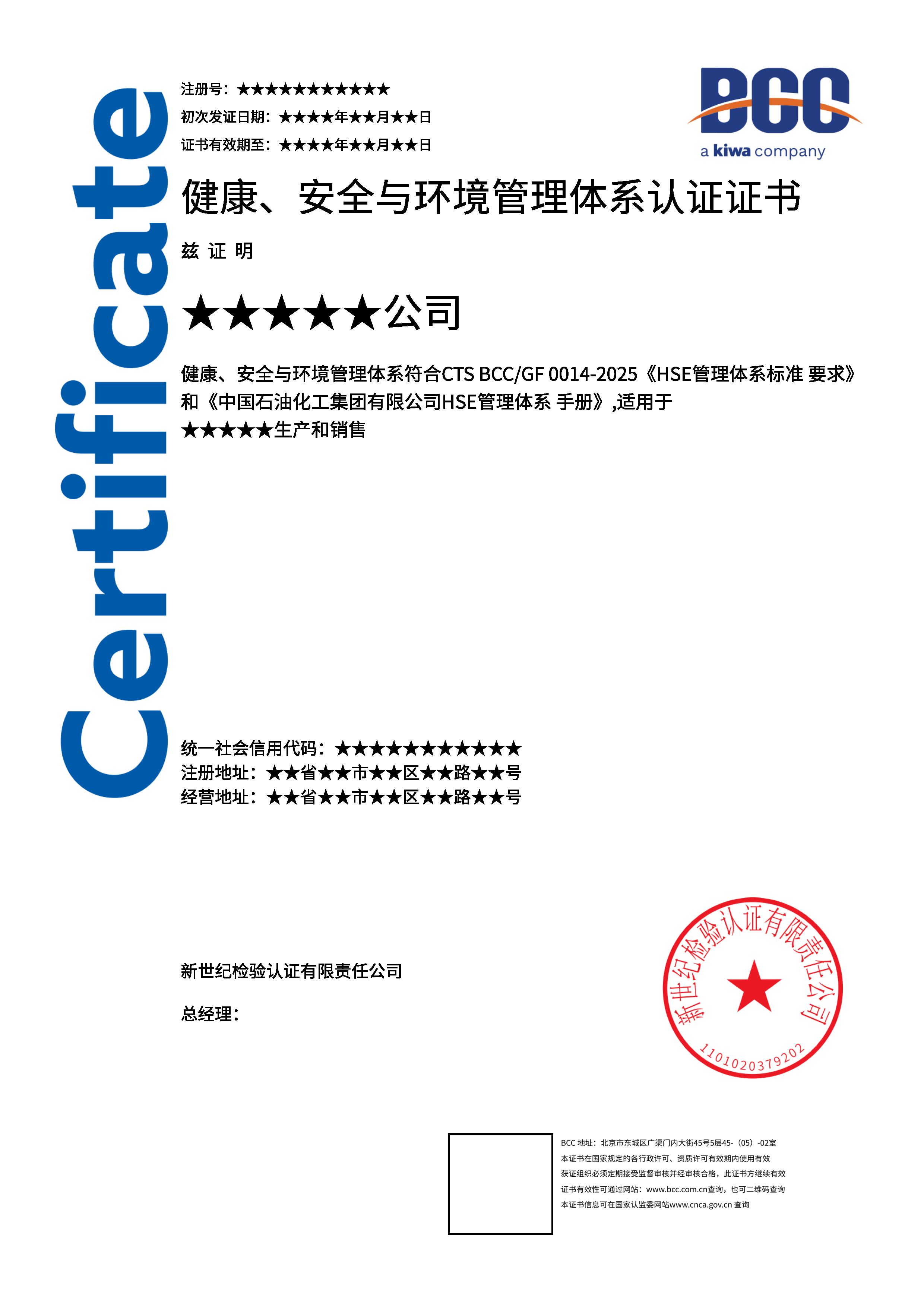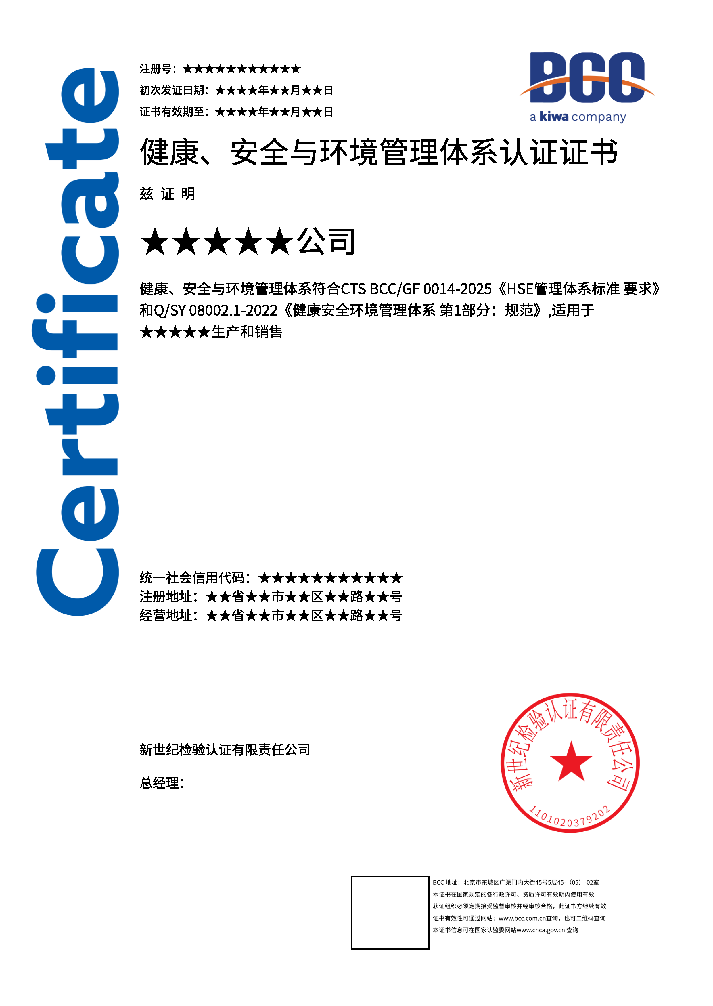 本頁涉及的認證服務中均有對應的《認證實施規(guī)則》,BCC擁有其最終解釋權(quán)。任何組織及個人未經(jīng)BCC許可,不得以任何形式全部或部分使用(法律要求除外)認證相關(guān)信息。如需獲取相關(guān)實施規(guī)則請用以下方式聯(lián)系獲取:電話:010-58579316 郵箱:fwjs@kiwa.cn