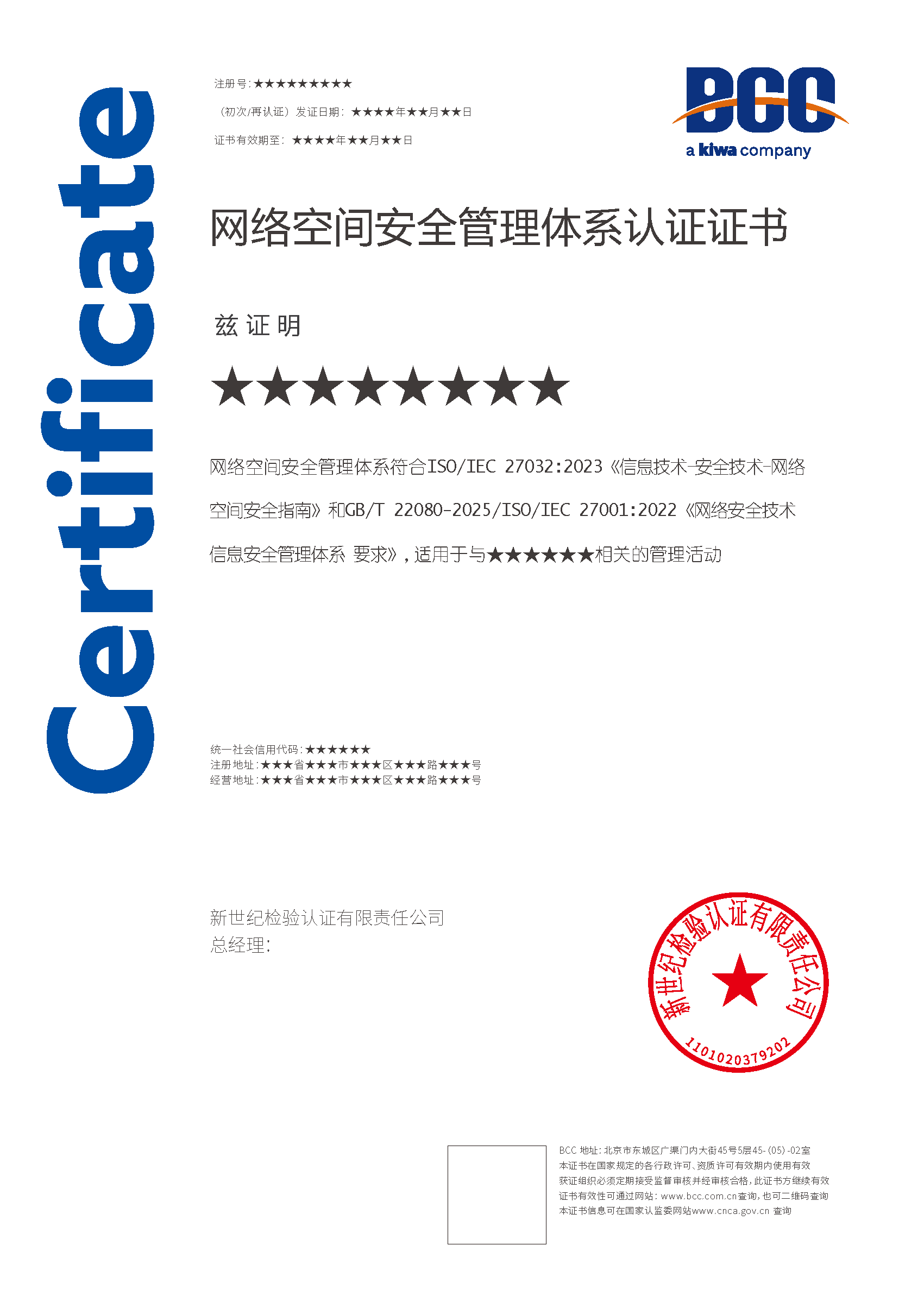 本頁(yè)涉及的認(rèn)證服務(wù)中均有對(duì)應(yīng)的《認(rèn)證實(shí)施規(guī)則》,BCC擁有其最終解釋權(quán)。任何組織及個(gè)人未經(jīng)BCC許可,不得以任何形式全部或部分使用(法律要求除外)認(rèn)證相關(guān)信息。如需獲取相關(guān)實(shí)施規(guī)則請(qǐng)用以下方式聯(lián)系獲?。弘娫挘?10-58579316   郵箱:fwjs@kiwa.cn