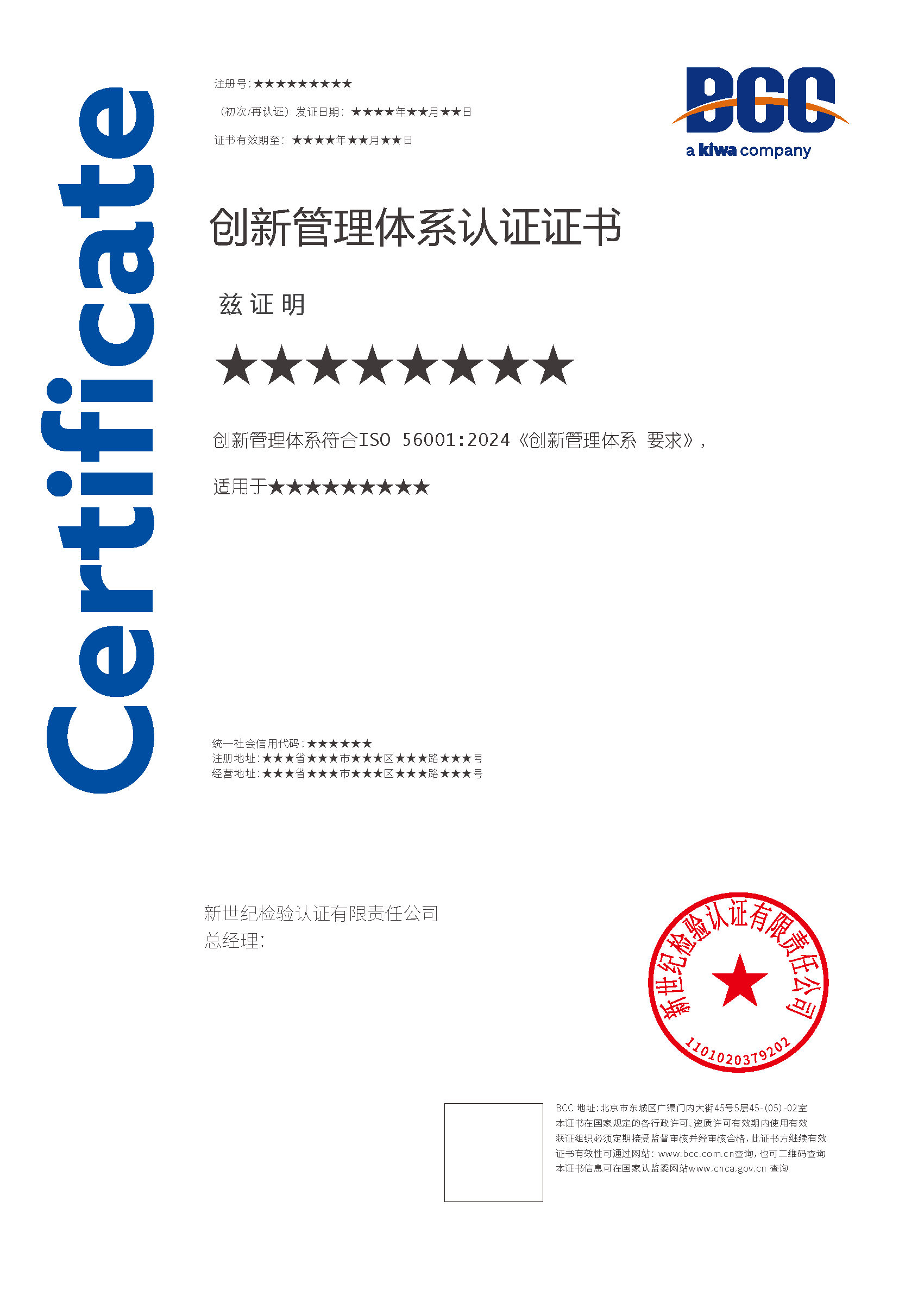 本頁涉及的認證服務中均有對應的《認證實施規(guī)則》,BCC擁有其最終解釋權。任何組織及個人未經BCC許可,不得以任何形式全部或部分使用(法律要求除外)認證相關信息。如需獲取相關實施規(guī)則請用以下方式聯系獲?。弘娫挘?10-58579316   郵箱:fwjs@kiwa.cn