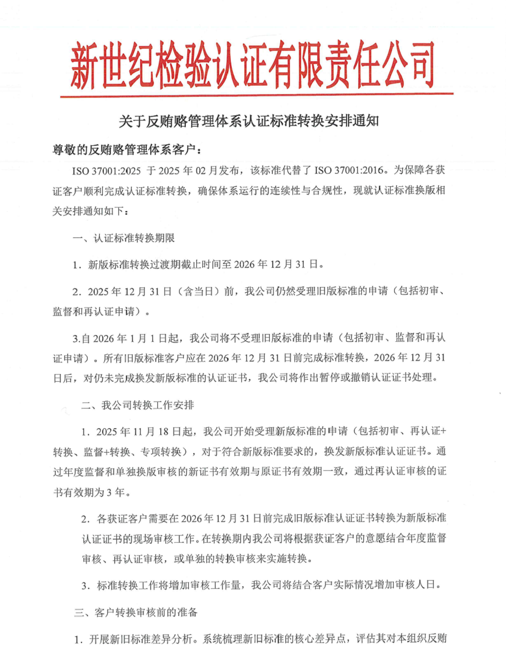 3.自2026年1月1日起,我公司將不受理舊版標(biāo)準(zhǔn)的申請(qǐng)(包括初審、監(jiān)督和再認(rèn)證申請(qǐng))。所有舊版標(biāo)準(zhǔn)客戶應(yīng)在2026年12月31日前完成標(biāo)準(zhǔn)轉(zhuǎn)換,2026年12月31日后,對(duì)仍未完成換發(fā)新版標(biāo)準(zhǔn)的認(rèn)證證書(shū),我公司將作出暫?;虺蜂N認(rèn)證證書(shū)處理。